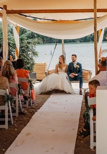 Het verhaal tijdens de ceremonie was echt ons verhaal, aangevuld door input van familie en vrienden. We hebben zitten schaterlachen van plezier maar ook met veel emotie naar de mooie verhalen kunnen luisteren. Al met al een dag, maar ook een ceremonie om niet te vergeten en we hopen dat Bente nog veel andere koppels mag begeleiden bij hun mooiste dag.